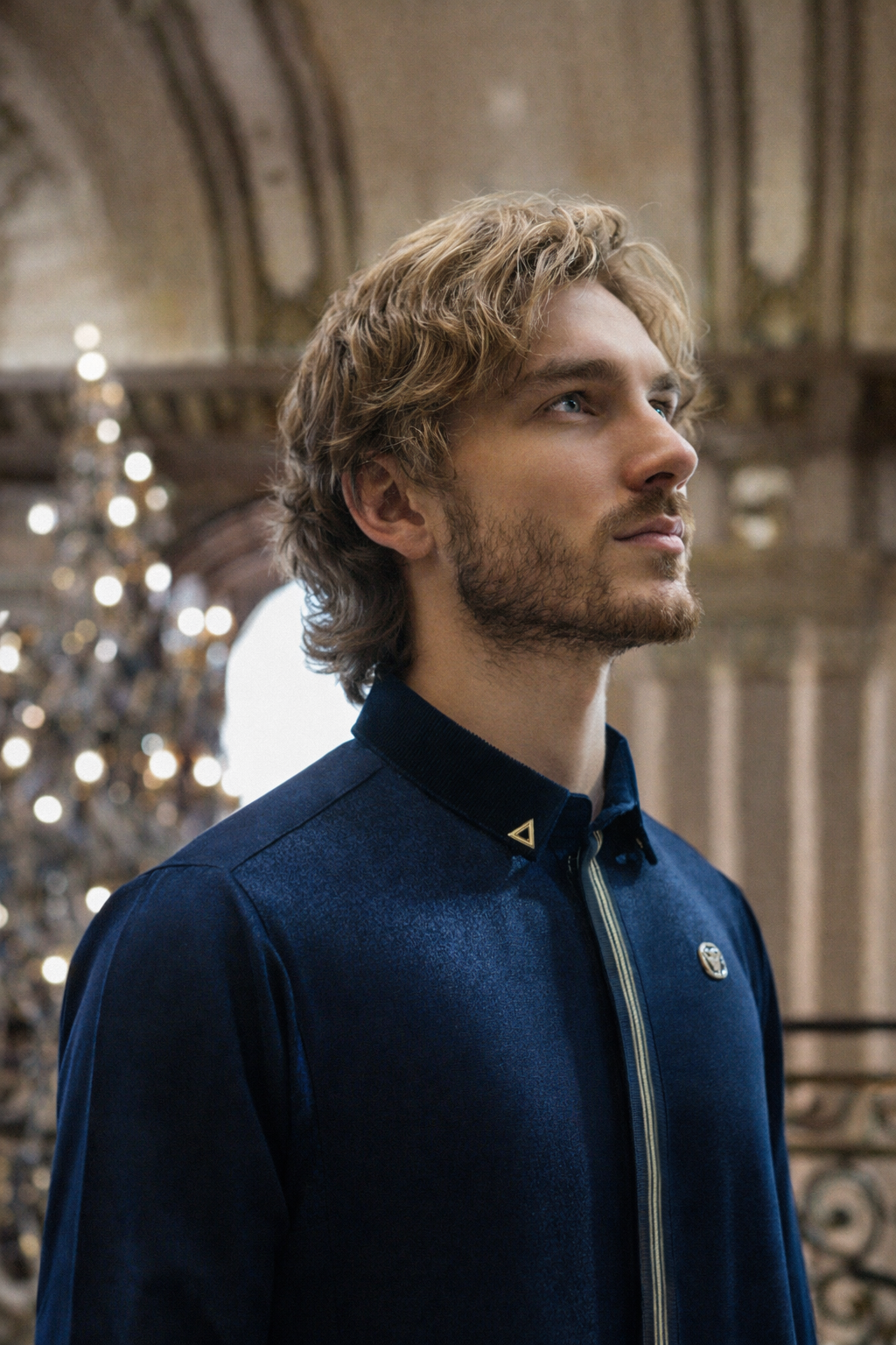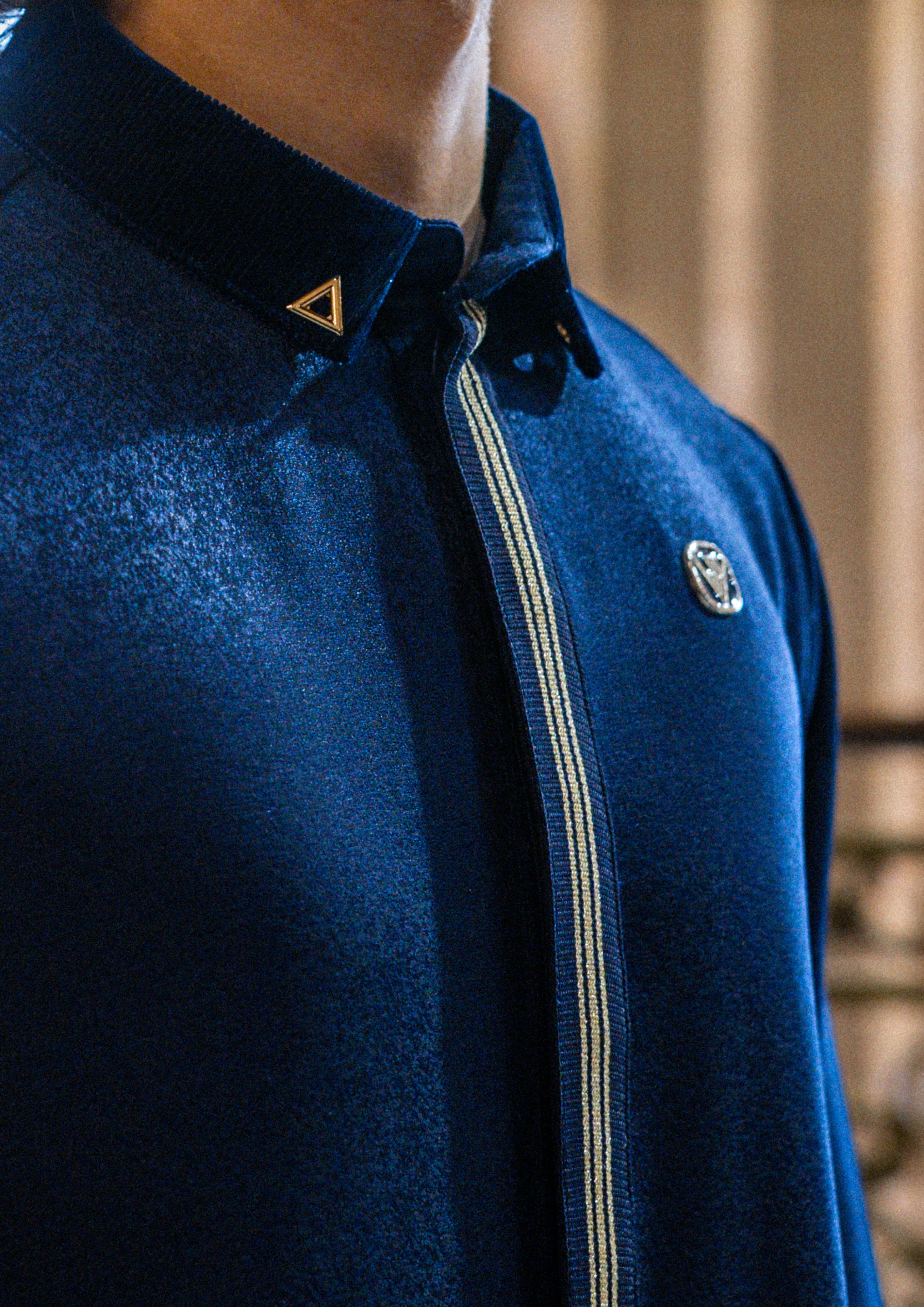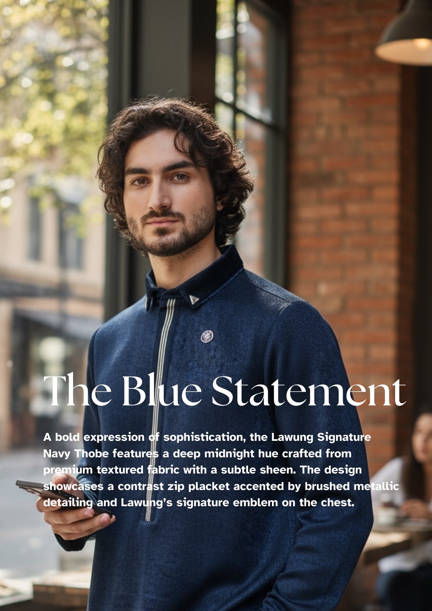 Crafted from a premium velvet-touch textured fabric, this thobe offers a rich navy tone with a subtle sheen, delivering both visual depth and all-day comfort. The snug stand collar is cleanly structured and accented with a minimalist metal triangle detail for a refined finish.