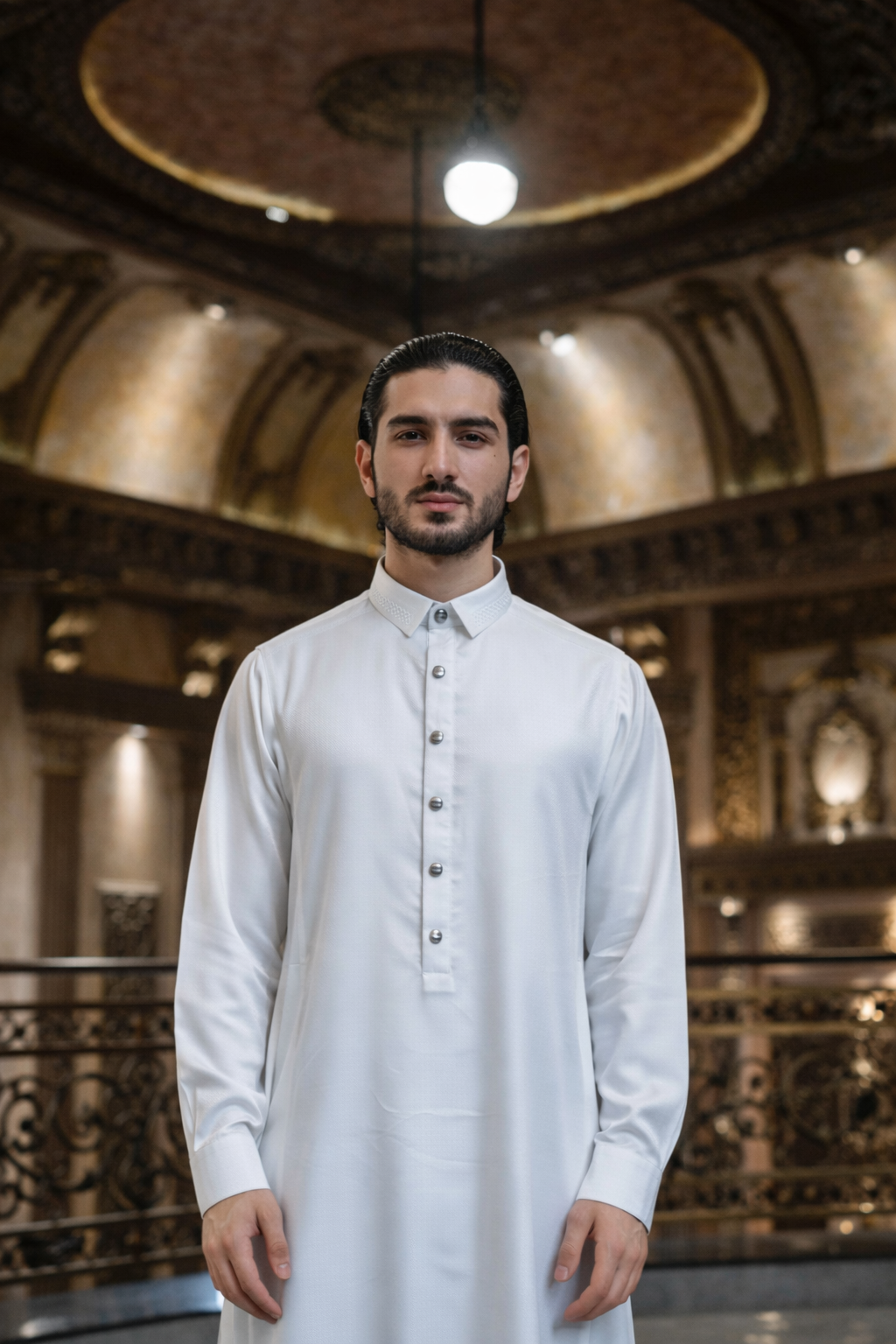 The AAR2637 Al Ameer Thobe is defined by refined detail and elevated craftsmanship. Made from premium woven fabric, it features a textured patterned collar, clean front fastening, and precise stitching for a sophisticated, modern finish. Designed to balance comfort with distinction, this piece reflects understated luxury rooted in Arabian heritage and refined through British design.