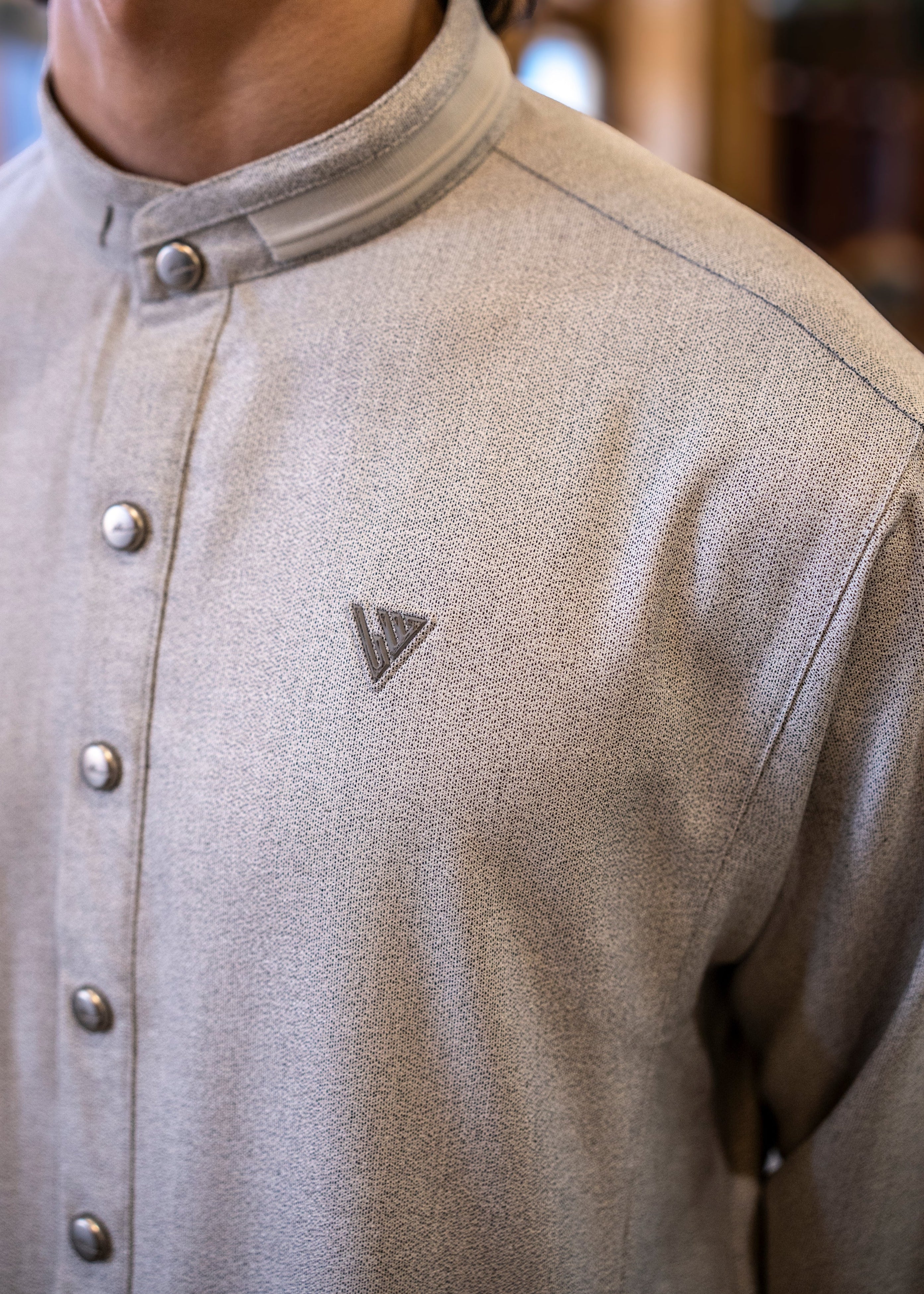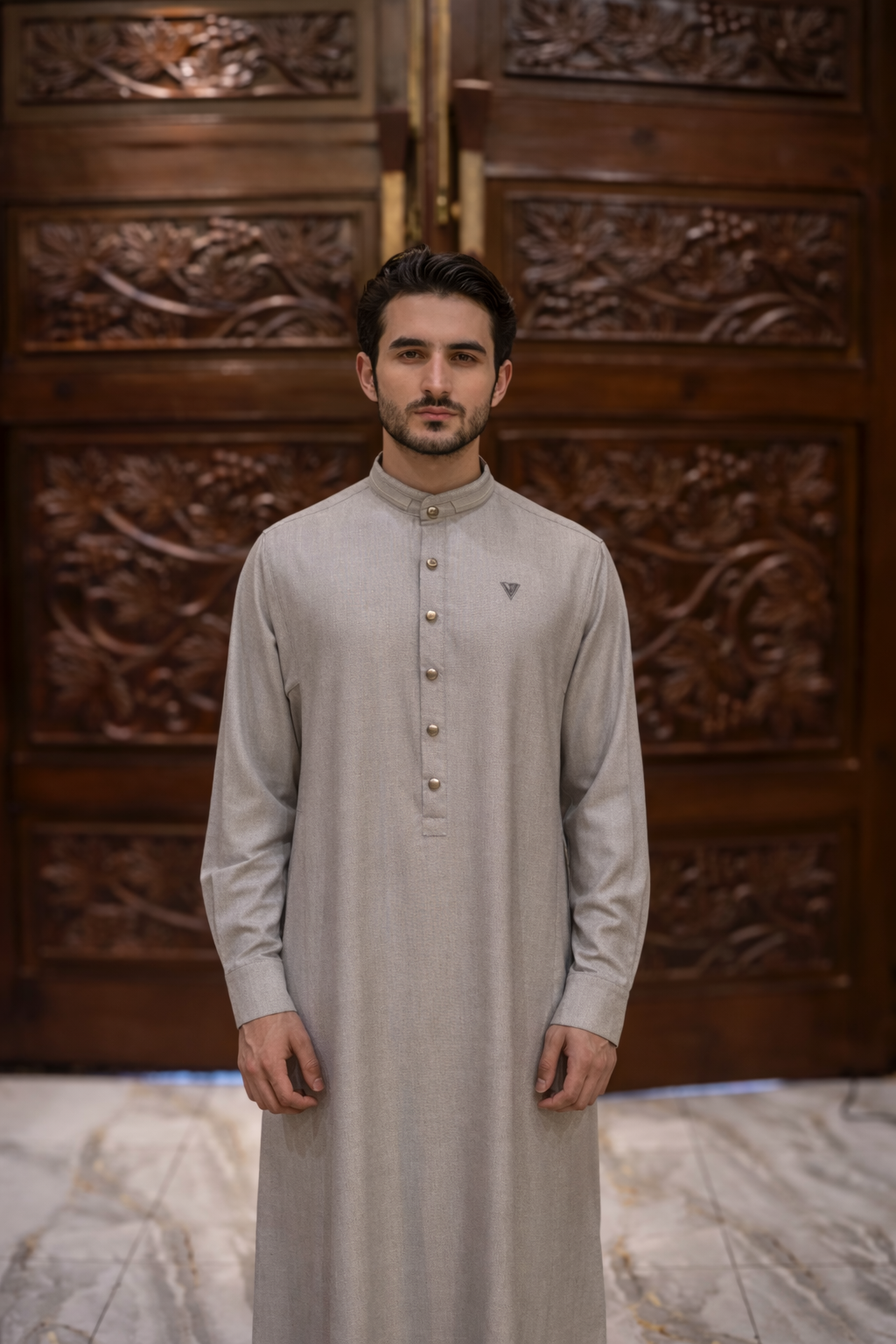 The AAR2648 Al Ameer Thobe reflects refined simplicity and modern elegance. Crafted from premium textured fabric, it features a clean mandarin collar, polished button detailing, and a subtle embroidered Al Ameer emblemfor a discreet, elevated finish. Designed for comfort and everyday sophistication, this piece embodies Arabian heritage refined through British craftsmanship.