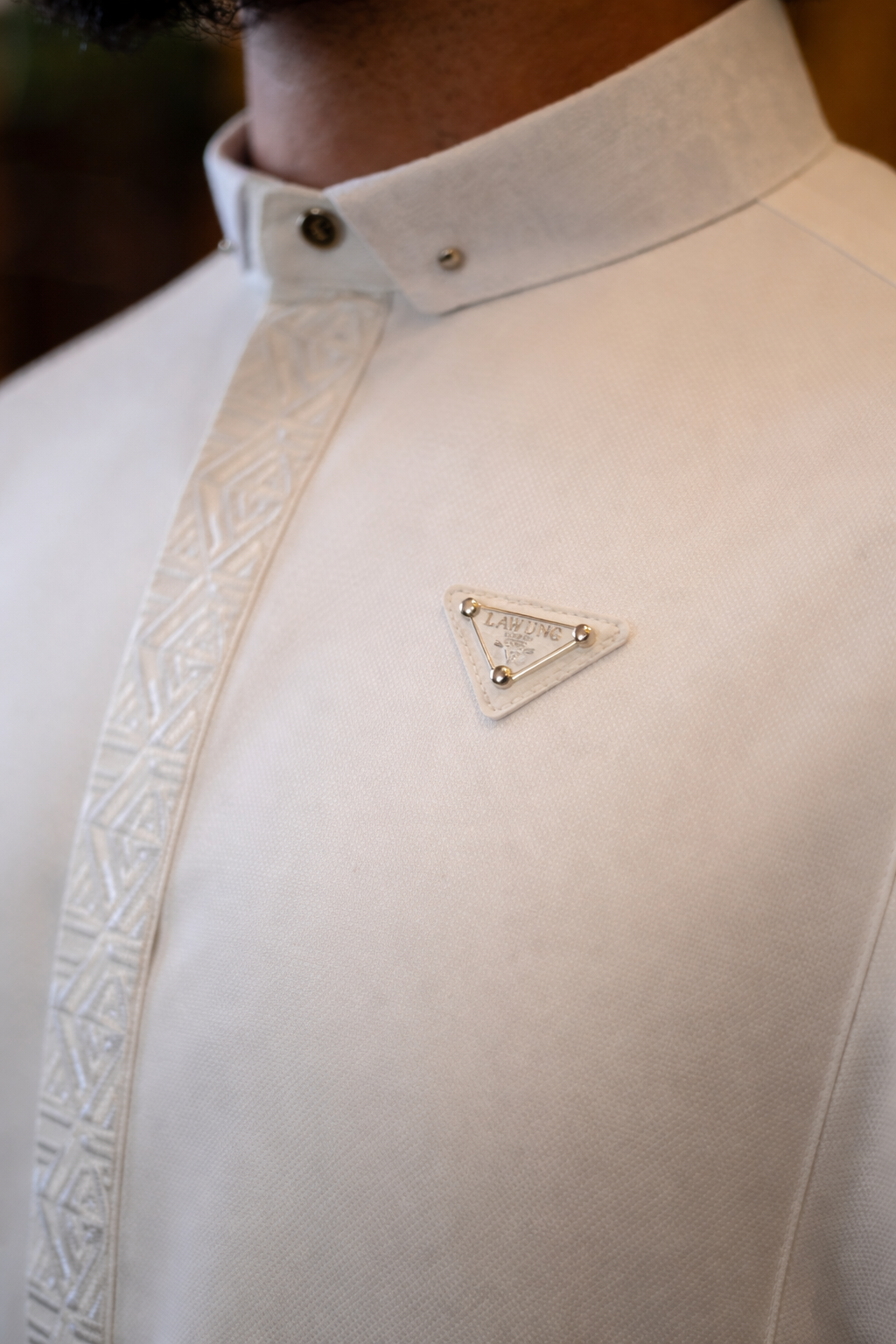 A geometric embroidered placket runs down the front, adding depth and character without overpowering the minimalist design. Finished with a discreet triangular metal emblem, this piece reflects quiet confidence and meticulous craftsmanship.